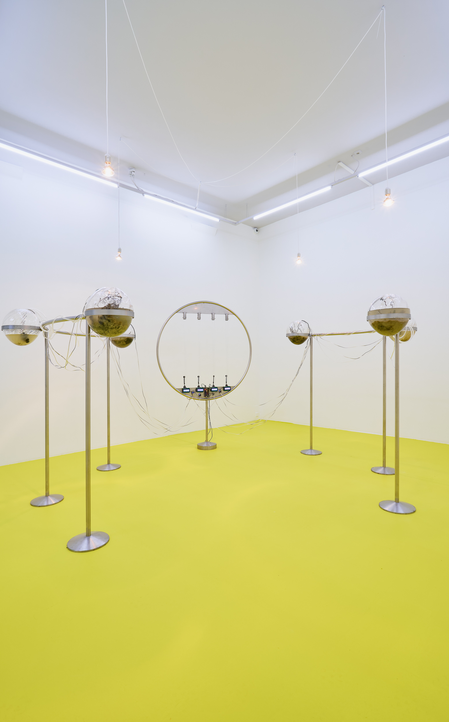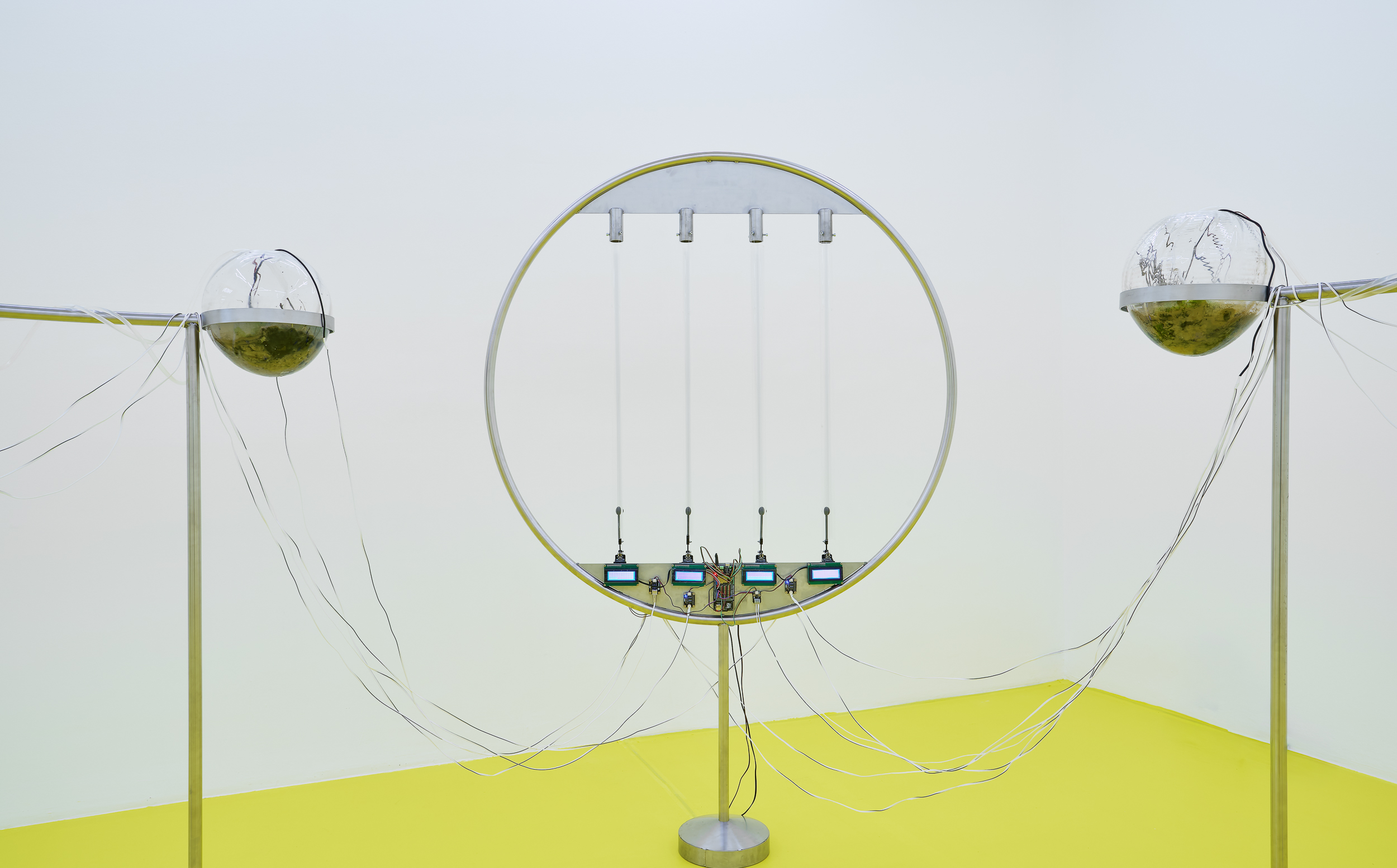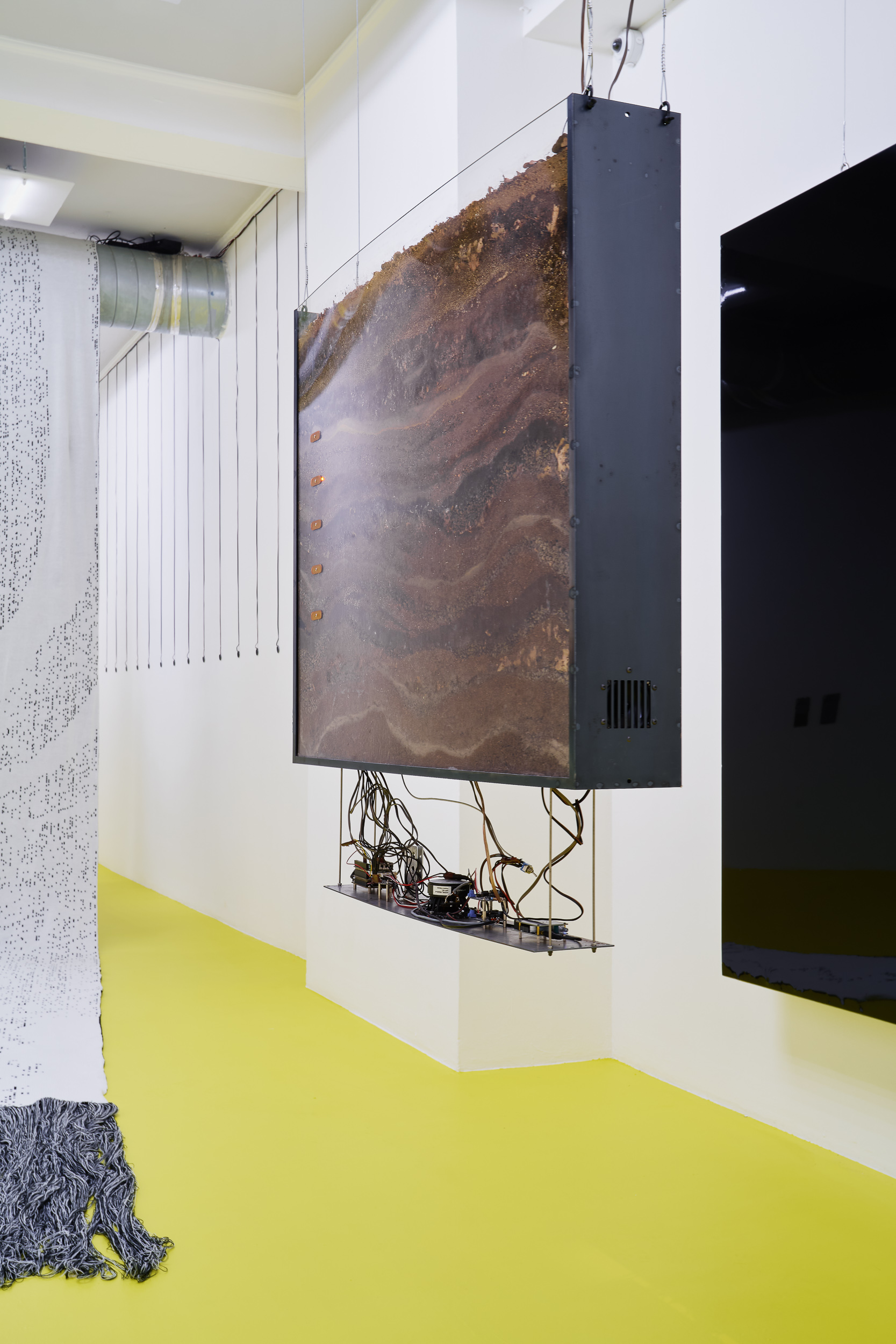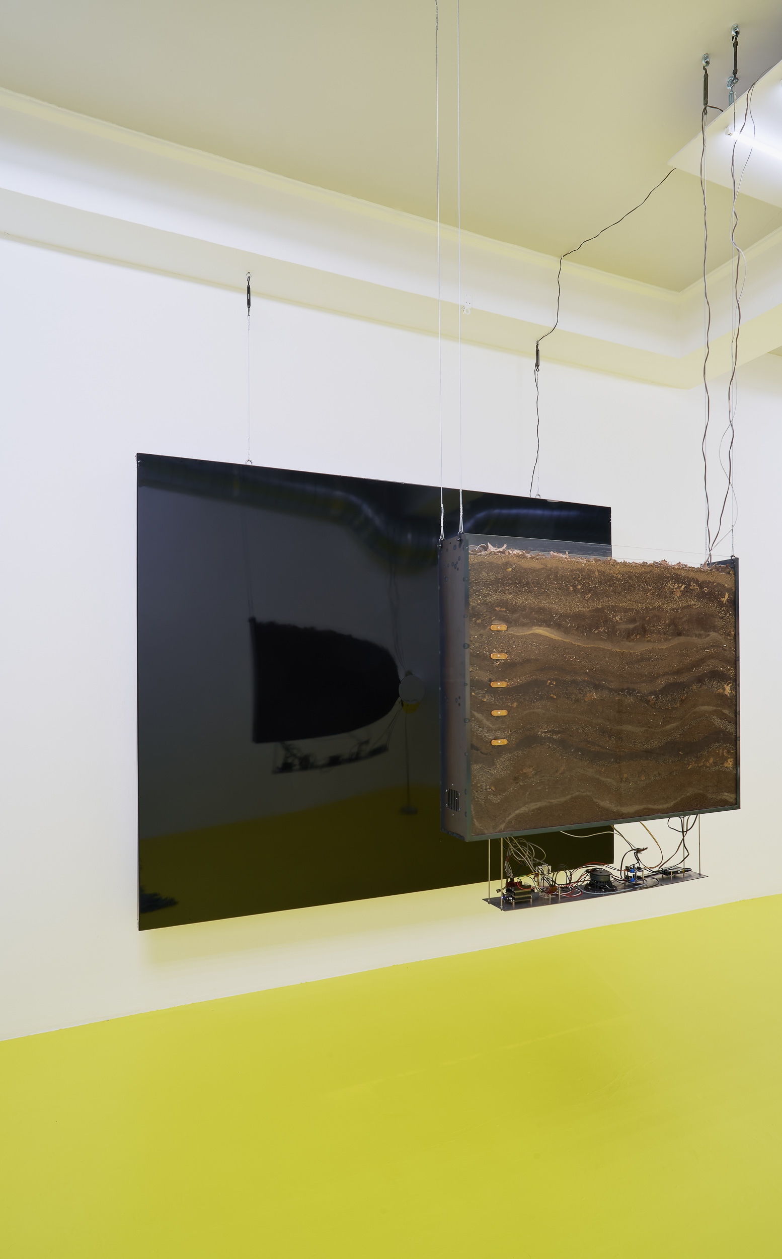 Positioned between site-specific installation and an experimental laboratory, the multimedia exhibition attempts to simulate natural and planetary processes while amplifying biological and physical phenomena that shape the shifting environmental conditions of life in the Anthropocene. The installations work with sound, vibration, data flows, and environmental signals, creating a spatial situation in which visitors become part of a dynamic field of relations between organisms, technologies, and landscape.