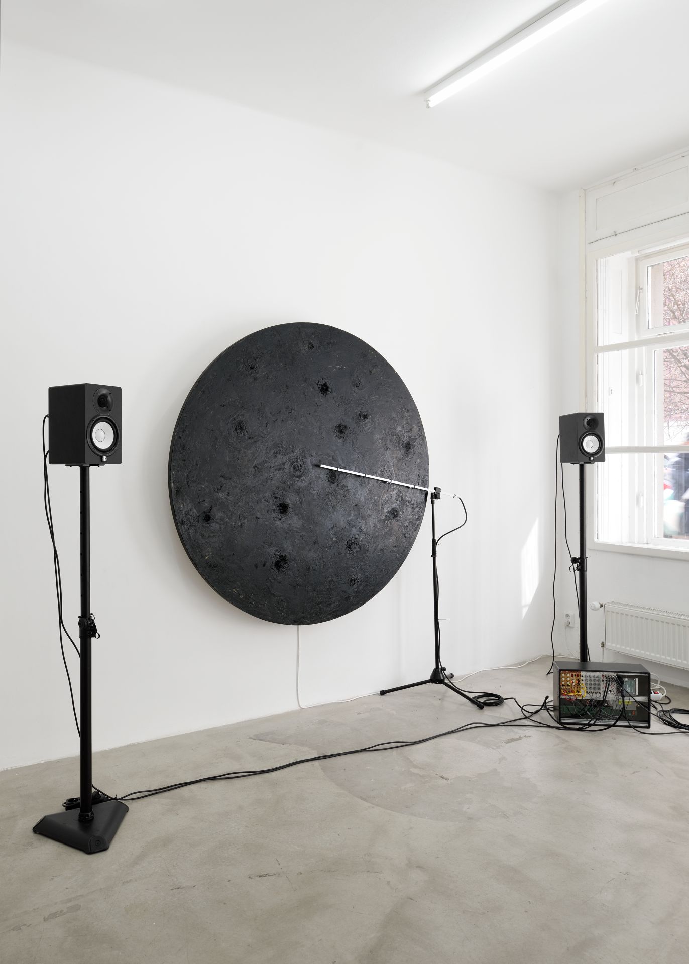 The four-channel sound installation Mumble Buzz contains field recordings of bees from a plastic barrel, from where they supplied the hive with rainwater in the summer. The sound loops were run over each other in sequences using magnetic sensors and magnetic dots placed on a rotating circular image. By slowing down the speed and reducing the bit rate of the sound, the remote original source is recorded and changed into continuous industrial noise. The manipulated buzz of the bees rotated in the gallery space, copying the rotation of the black circle and the shape of the barrel from which the record comes.